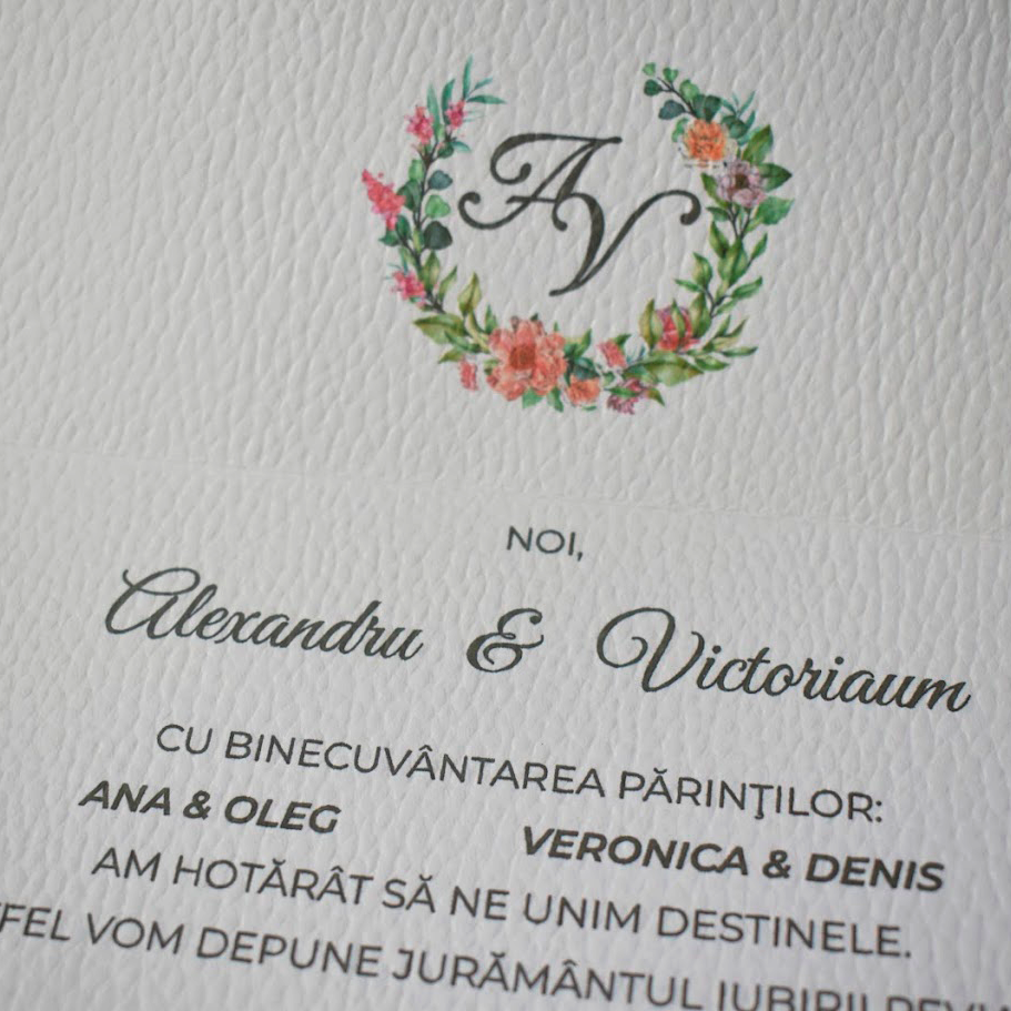 Această invitație deosebită este realizată pe hârtie texturată de calitate superioară, având marginile tăiate manual pentru un efect artizanal unic. Designul său delicat îmbină romantismul elementelor florale cu eleganța detaliilor clasice, creând o invitație ce reflectă gustul fin al mirilor.