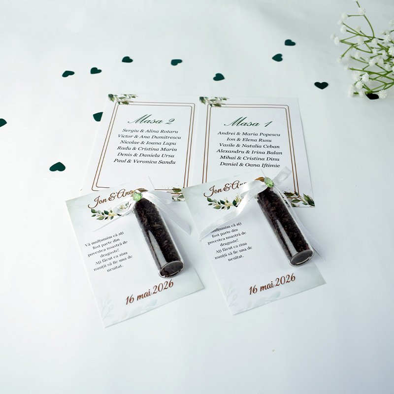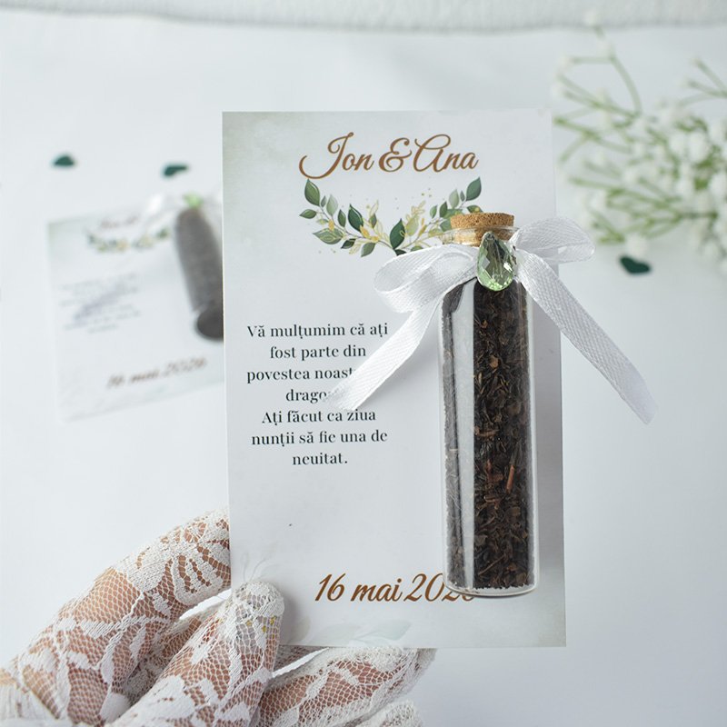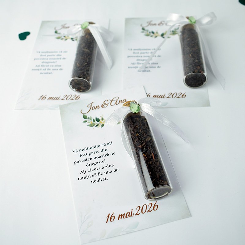 Oferiți invitaților o amintire elegantă și utilă cu aceste sticluțe umplute cu ceai aromat, perfecte pentru nuntă, botez sau orice alt eveniment special.