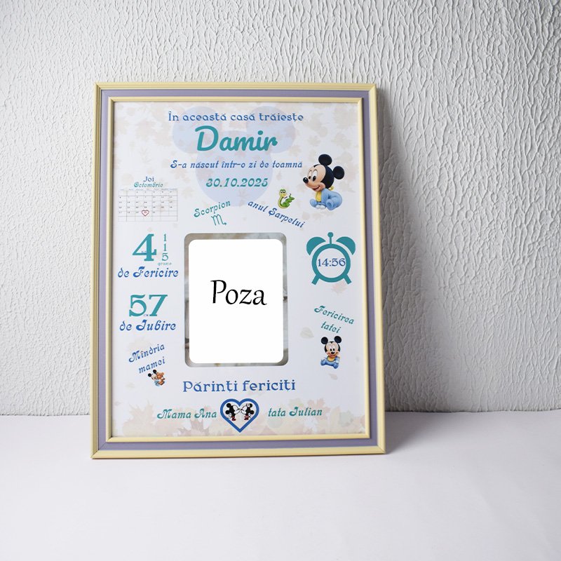 Designul include o fotografie a copilului, înconjurată de frunze aurii și elemente inspirate din natură, care redau atmosfera blândă a toamnei.